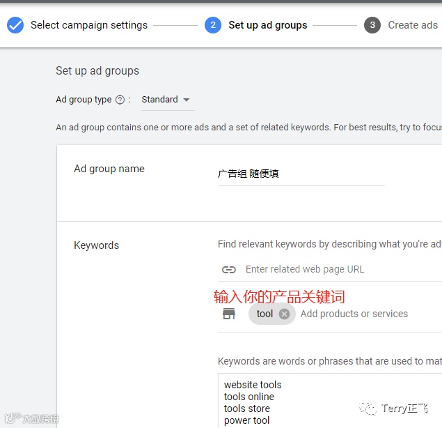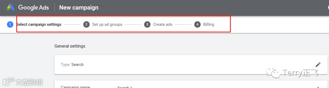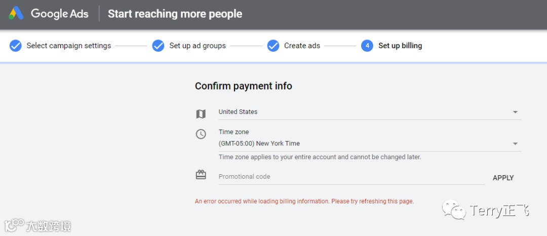 能看得出来,Google 开始引导我们去新建 广告系列-广告组-创建广告,外加补充 账单信息: