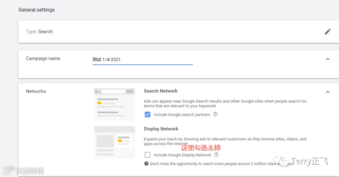 广告系列名字,暂时随便填,展示广告那个勾选去掉 其实暂时无所谓啦: