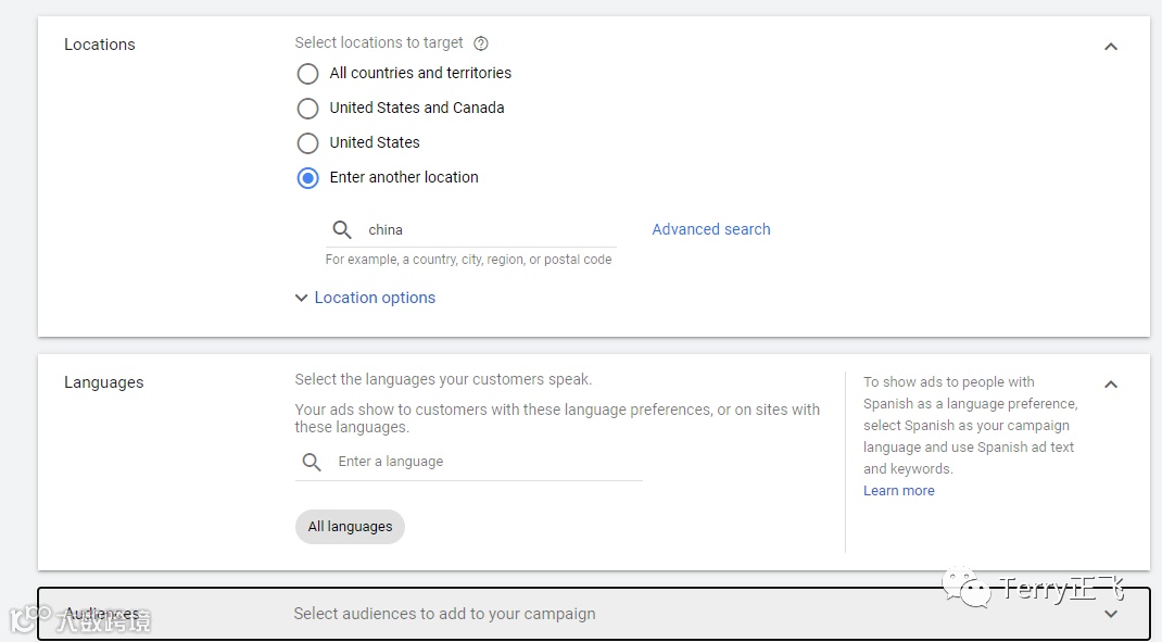 位置,语言,受众这些都先默认就好,以后正儿八经投广告的时候再说。何况,这个广告系列建好后,我们 暂停 就可以了——