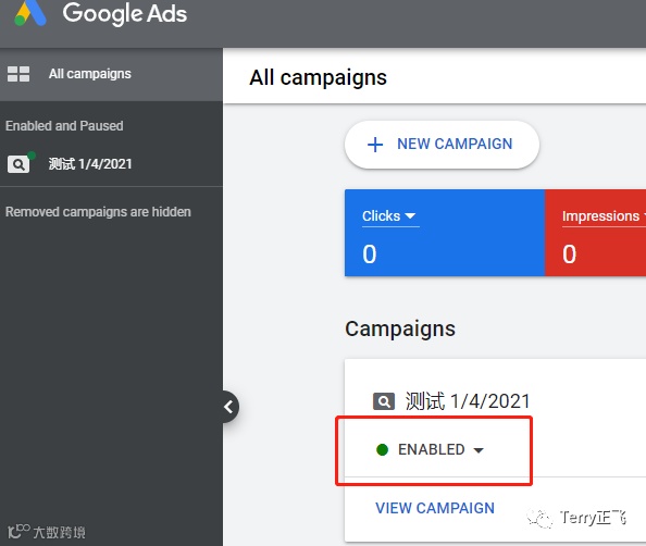 点击 ENABLED 右边的倒三角,选择 PAUSED. 然后导航栏左边状态变成灰色,说明暂停成功。