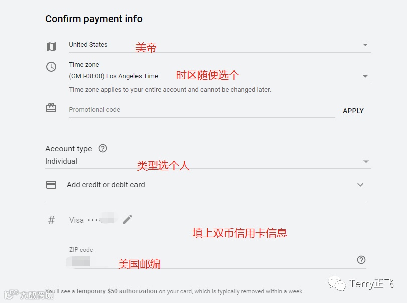 选 美国 ,账号类型选 个人,填上双币信用卡信息,以及邮编,点击提交: