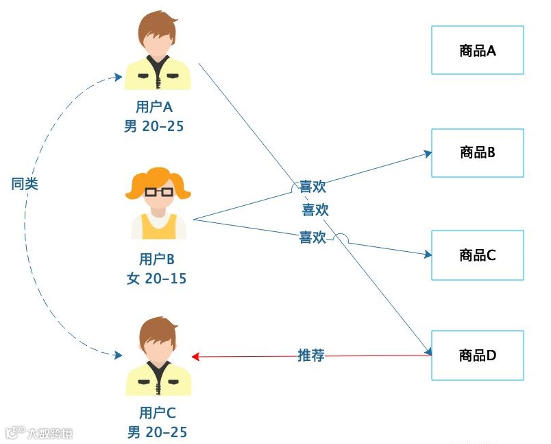 非常著名的协同过滤算法就是基于圈层效应的一个延伸,如下图,如果单纯从年龄的角度划分圈层,AC同属于同一圈层,用A喜欢的商品D推荐给用户C,这种推荐很大程度上符合对方的消费习惯。如图: