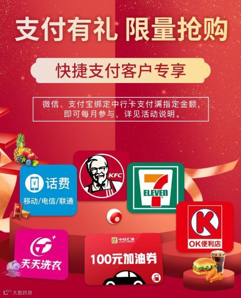 1) 在上一自然月内,持有中行借记卡新绑定微信、支付宝的用户,使用该卡通快捷支付累计支付满88元,当月即可参与;