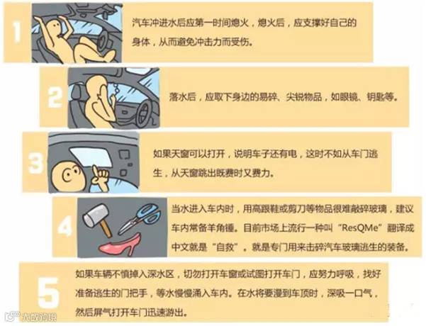 当整个车辆马上被水灌入,努力呼吸,在水将漫到车顶时,深吸一口气,然后借助内外平衡的压力打开车门,迅速游出。