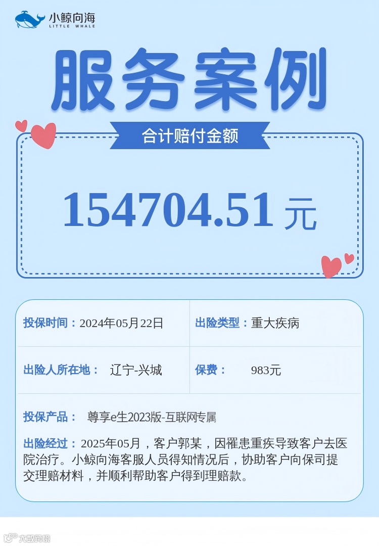 2024年5月,辽宁兴城53岁的郭女士,在小鲸向海小程序为自己投保了一份“尊享e生2023”百万医疗险。这笔每年983元的保费投入,是她对家庭未来一份安稳的期许。然而,命运的残酷远超想象。仅仅半年后,一纸“急性髓样白血病”的确诊书,瞬间将这个平凡家庭的宁静击得粉碎。