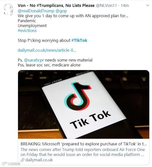 “我们给你1天时间来制定计划,以解决大流行性和失业的问题,别他妈的担心TikTok”