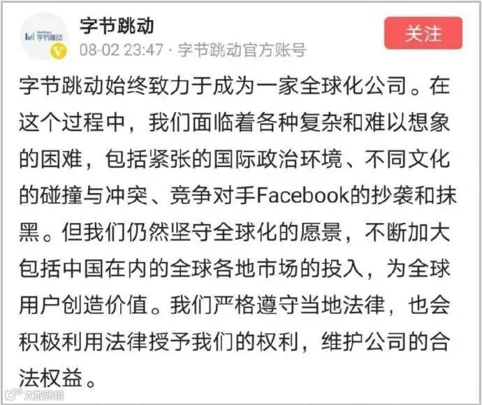8月2日,字节跳动官方发文,称被竞争对手Facebook抄袭和抹黑!