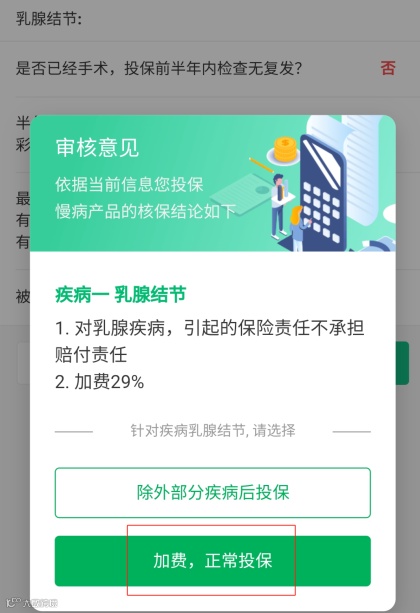 加费承保:在原来 293 元保费的基础上,加 29% 也就是加 85 元,把乳腺疾病也保障上。