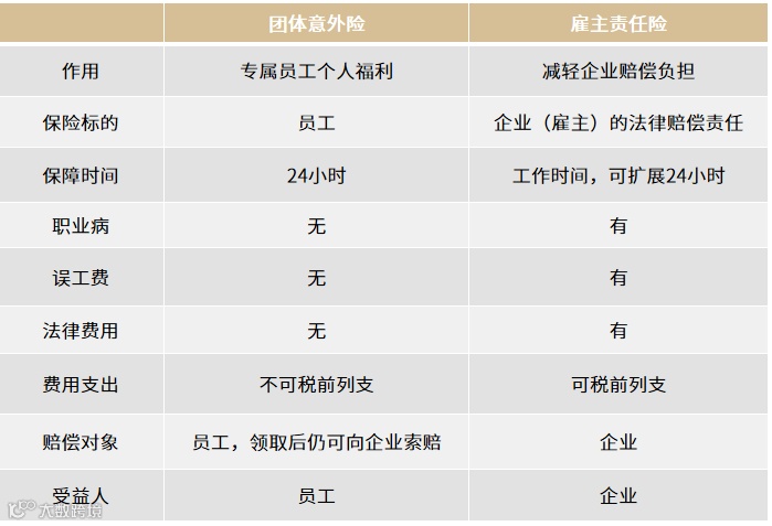 团体意外险:保障的是员工,专属员工个人福利,当员工不幸发生意外事故,不限工作期间和非工作期间,可向保险公司提出理赔,赔付金直接赔付到员工账户上。