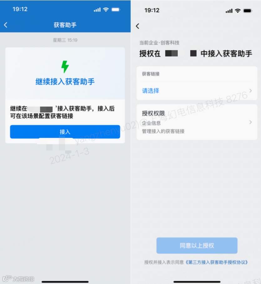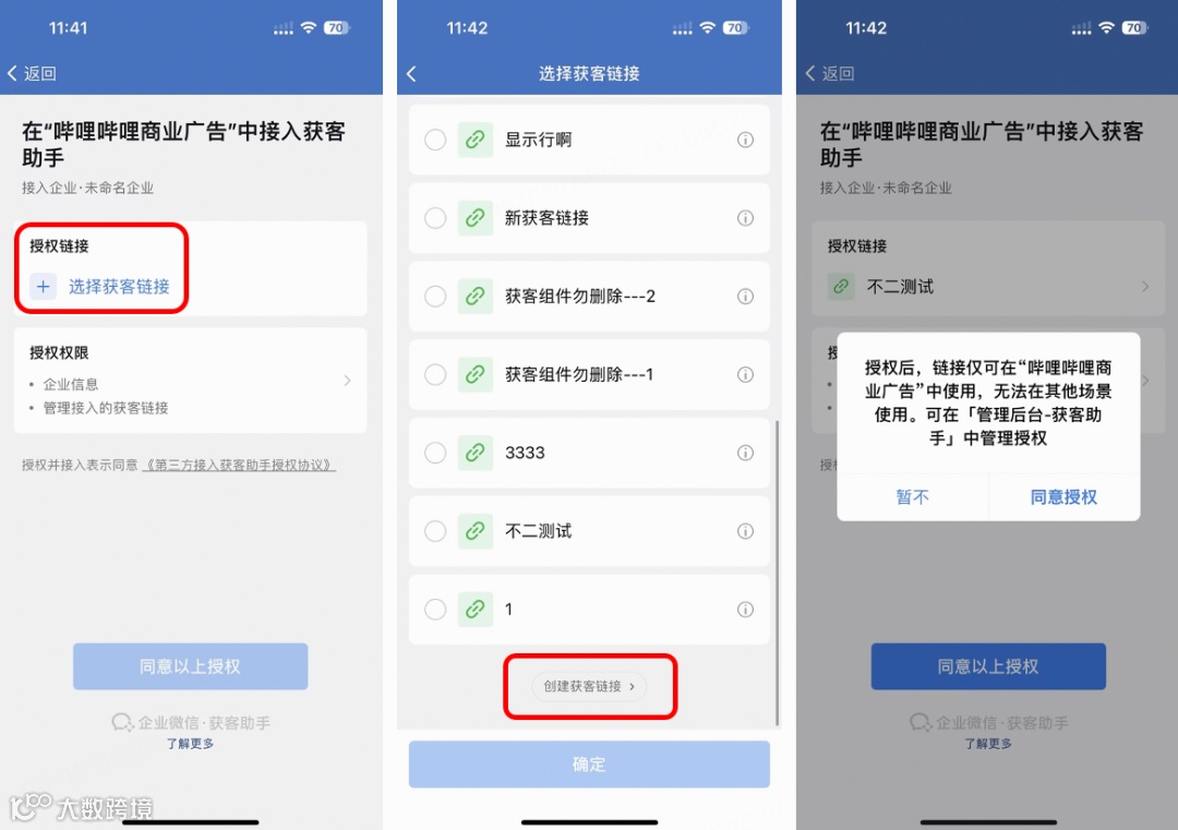 1、选择微信包地方点击新建获客链接 通过认证的企业扫描授权