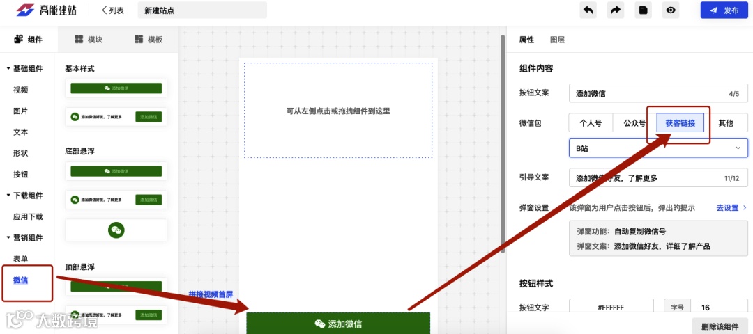● 落地页必须使用高能建站微信加粉组件+获客链接的形式