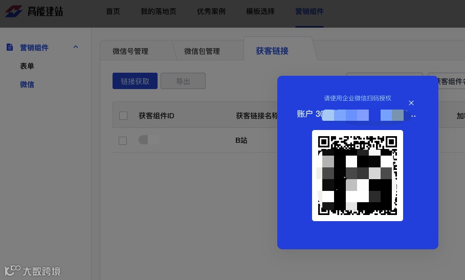 高能建站中扫码后选择对应获客链接,若无存量链接,可先创意获客链接