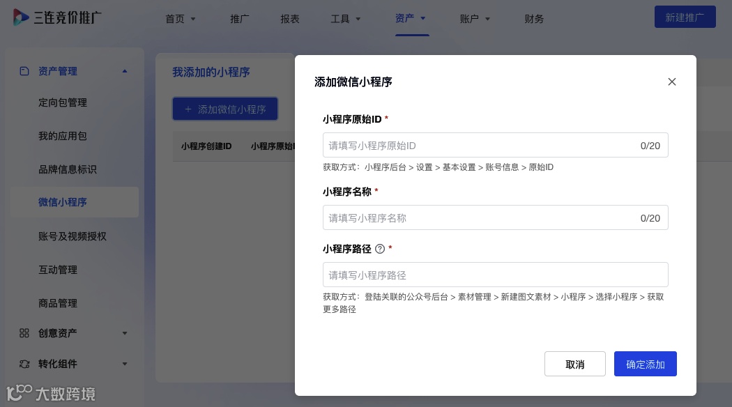 1、先通过资产栏目——微信小程序,添加微信小程序包