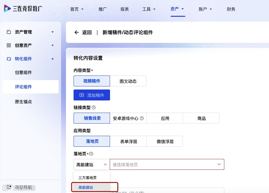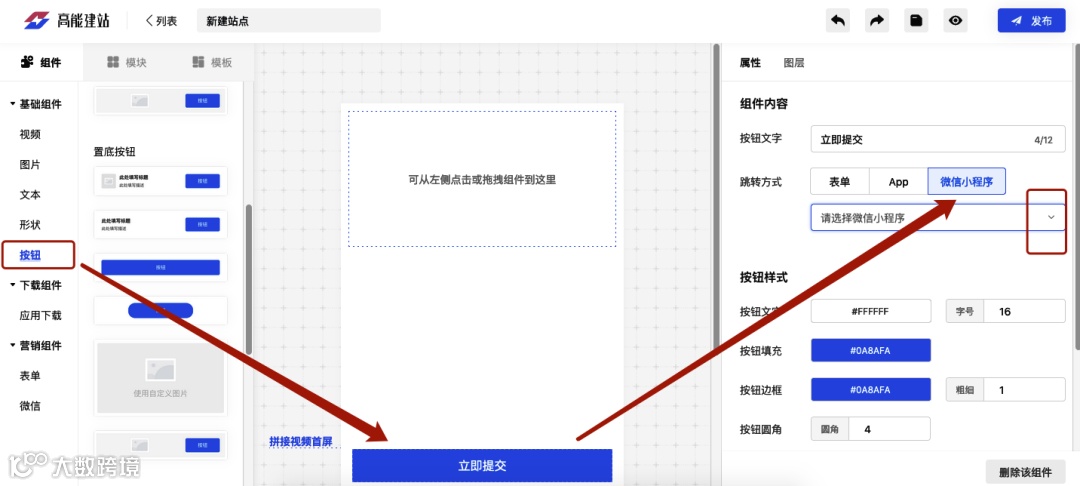 通过工具栏目——高能建站进入,新建落地页,页面添加左侧按钮,按钮跳转方式选择【微信小程序】,选择已配置的小程序组件;