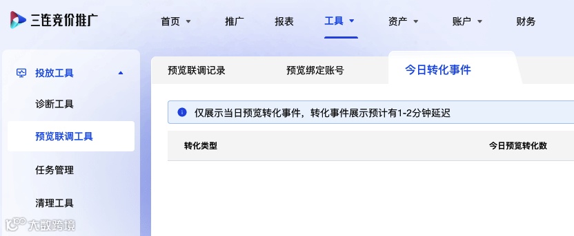 开启后1-2分钟后,进入哔哩哔哩app内进行刷新广告,检查广告链路是否能顺利完成唤端跳转,同步有数据回传的客户可通过【工具】——【预览联调工具】——【转化事件】查看是否有转化数据回传