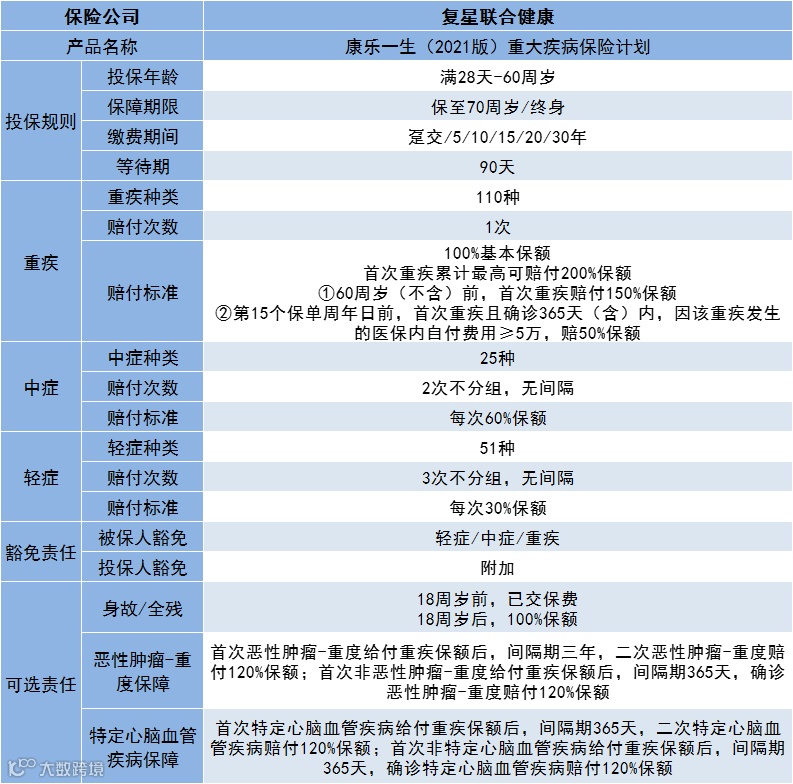 但在2021年,复星联合健康”满血复活“,继”妈咪保贝(新生版)“之后,又推出了一款性价比超高的重疾险——康乐一生(2021版)重疾保险计划。