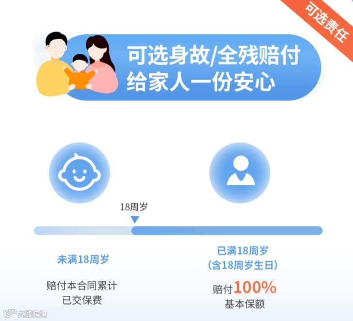 ①身故/全残保障 附加该项责任后,若被保人在18周岁前不幸身故,保险公司赔付已交保费;如果被保人在18周岁后不幸身故,则可以获赔100%疾病保额。需要注意的是,如果大家选择保至70岁,这项责任是必须附加的,如果选择保终身,则可以自由选择是否附加。
