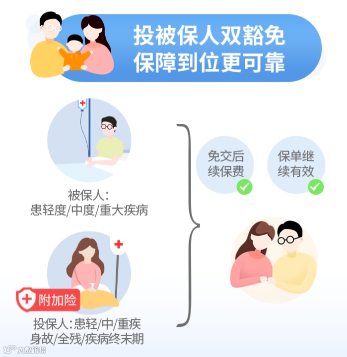 附加后,投保人确诊轻/中/重疾,或者不幸身故/全残,以及达到疾病终末期都可以豁免后续保费。