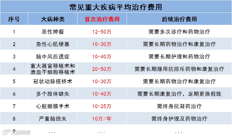 很多常见疾病治疗费用,像恶性肿瘤,脑中风后遗症等治疗费用均在10~50万左右。