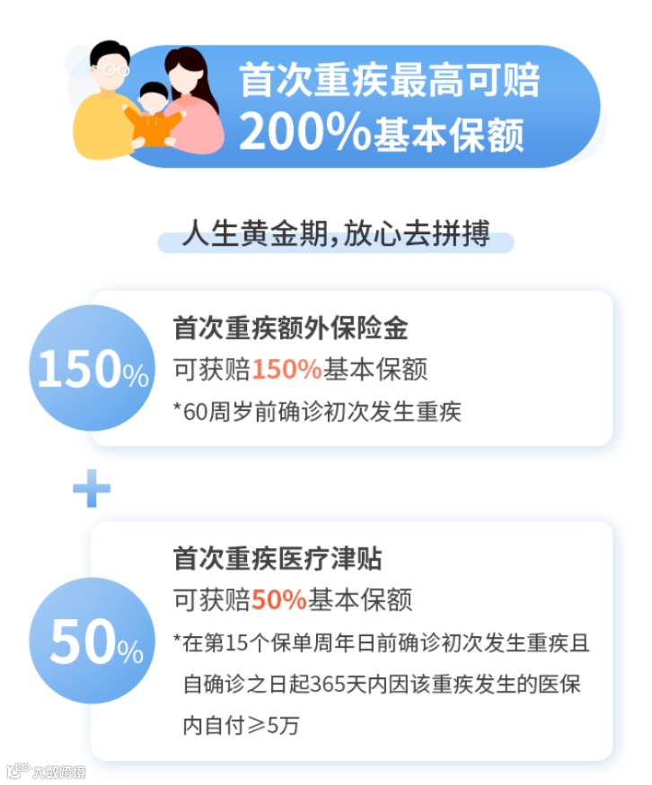 ②保单前15年得了重疾,365天内医保内自付费用超过5万,额外再赔50%基本保额。