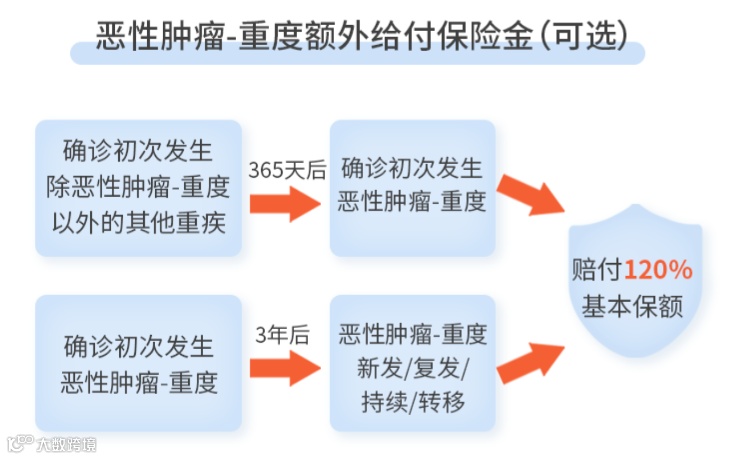 首次非恶性肿瘤-重度→恶性肿瘤-重度,仅需间隔365天,即可再赔120%保额;