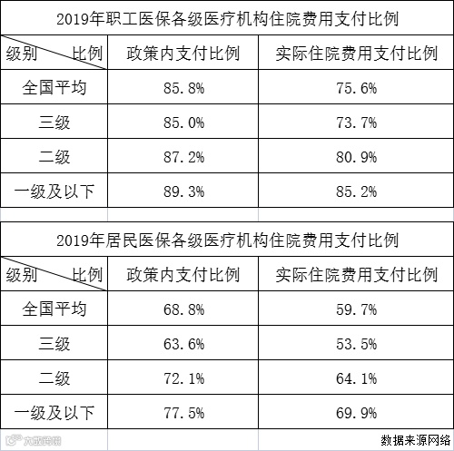 2019年,职工医保住院费用实际报销全国平均比例75.6%,个人负担24.4%;居民医保住院费用实际支付比例59.7%,个人负担40.3%。就是说,大部分职工医保范围内医疗费只要超过20万,就会达到5万的赔付标准;居民社保内医疗费只要超过12万就能达到。