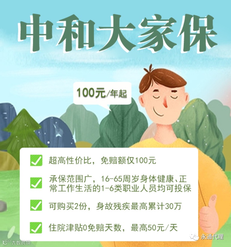 超高性价比:12万身故、残疾保障+2万意外医疗保障,只需100元/年;承保范围广:承保年龄为16至65周岁,1-6类职业均可投保。