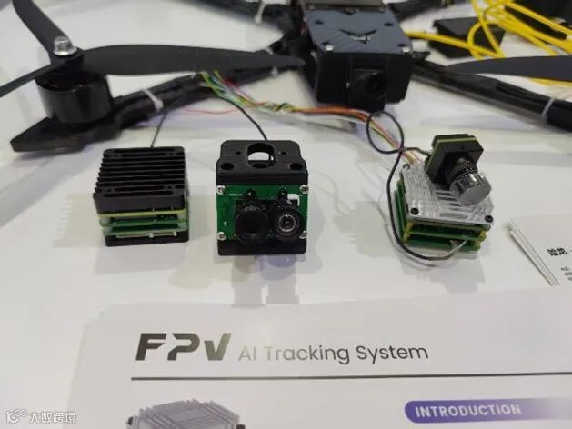 另一个重要的方面就是FPV的图像系统。随着反无系统技术日趋成熟,FPV在攻击末端时受到电磁干扰已经成了限制FPV在战场上大量应用的主要原因,导致后方的飞手无法可靠控制FPV进行攻击。因此,给FPV部署图像自主识别跟踪系统,引导FPV对目标的自主打击,是解决FPV末端攻击容易被干扰的主要技术手段。展会上,多家公司在这方面推出了相关模组产品。上博智像、翔拓科技均展示了应用于FPV的AI自主跟踪图像系统,如下图所示。FPV AI跟踪模块可利用强大的算力,实现了实时的AI识别、跟踪以及跟飞控制功能。