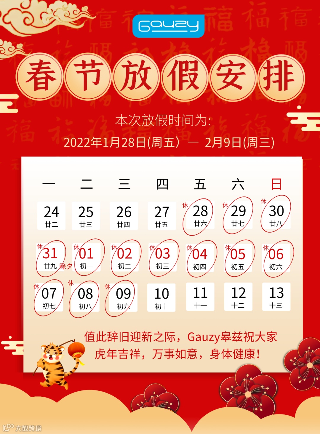 导读:春节啦..Gauzy皋兹放假安排2022年1月28日-2022年2月9日