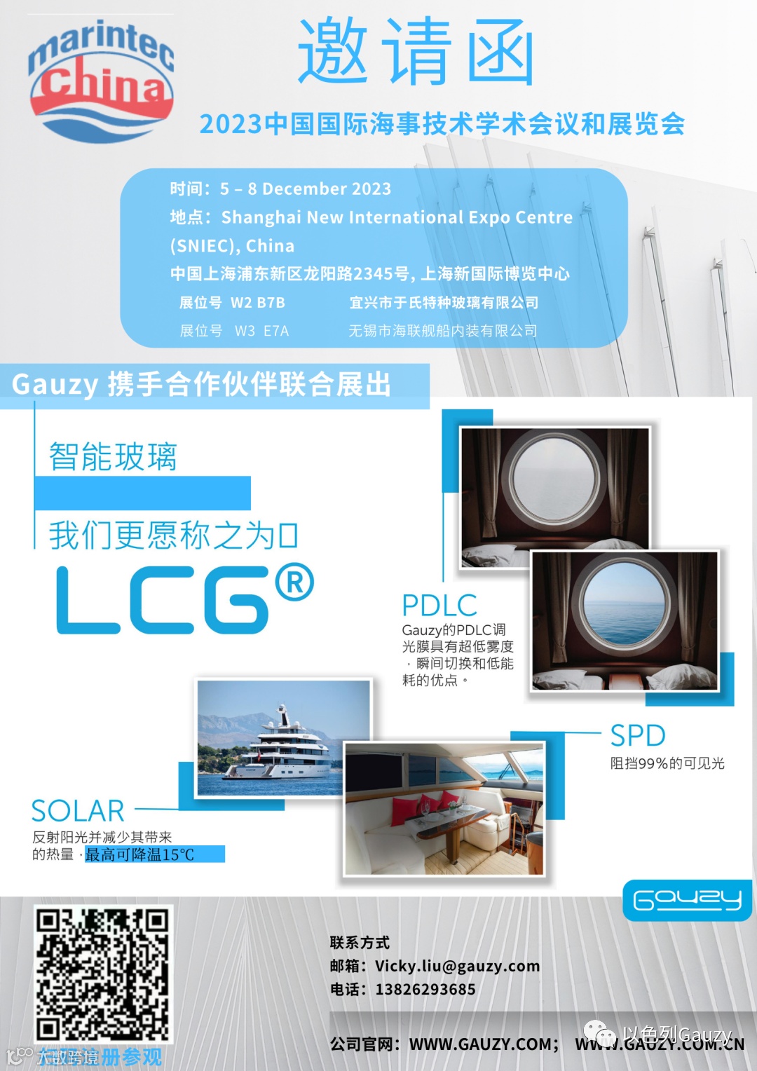 2023中国国际海事技术学术会议和展览会于12月5-8日在上海新国际博览中心召开,Gauzy公司携手合作伙伴于氏特种玻璃有限公司,海联舰船内装有限公司展位联合展出。展现了Gauzy阳光控制调光膜、SPD玻璃、最新宽温膜在船舶行业的应用。