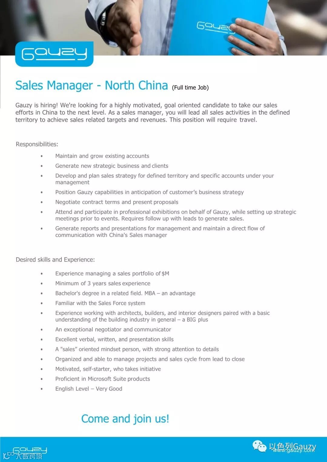 随着Gauzy公司在中国的日益发展与壮大,诚邀有志有才之士加入我们。华北区销售经理火热招募中,要求全职、有隔断行业经验的人士优先,具体参考如下: