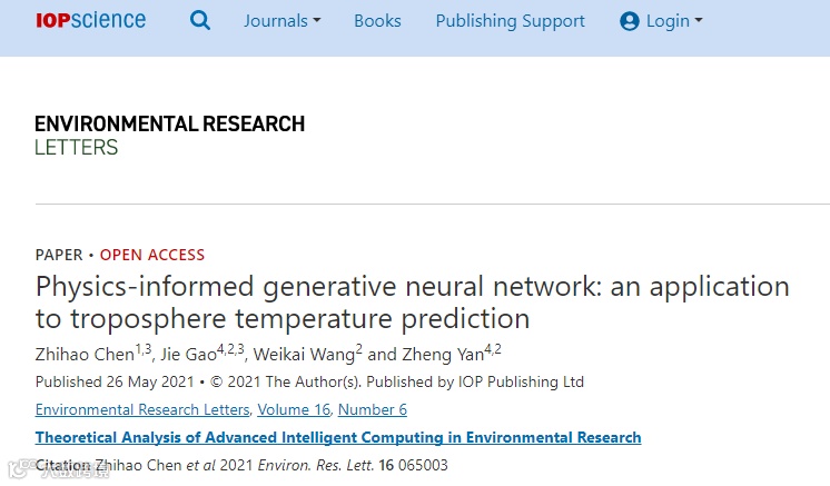 近日,眼控科技人工智能研究院撰写的题为《基于物理辅助的生成神经网络在对流层温度预测中的应用》(Physics-informed generative neural network: an application to troposphere temperature prediction)研究成果正式发表于英国物理学会(IOP)出版社主办的开源期刊《环境研究快报》(Environmental Research Letters)上。英国物理学会(IOP)是国际性的学术协会和专业机构,是全球顶尖的专注于物理及相关学科的科技出版社,该期刊在中国科学院分区中的气象与大气科学学科中被分为一区top期刊。