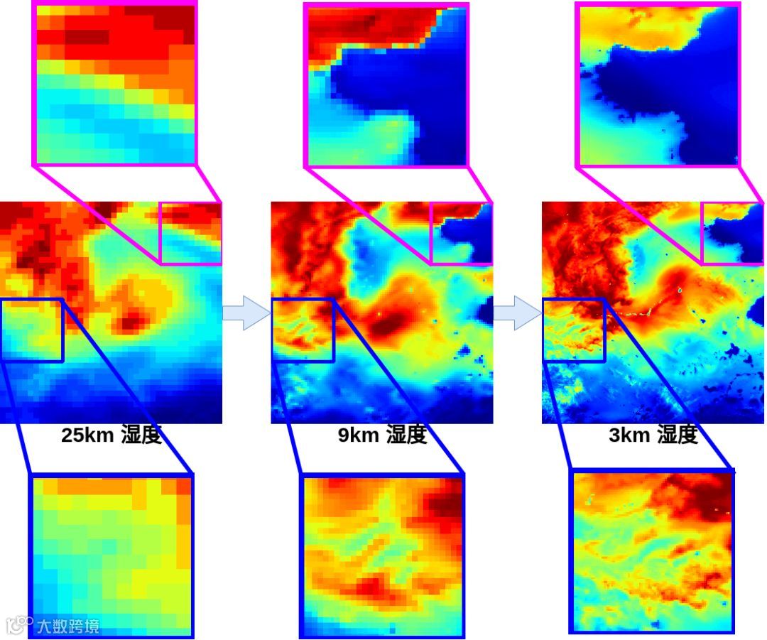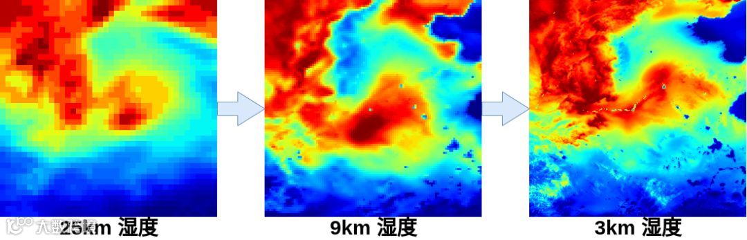超分辨率技术,是将一张低分辨率的图像变为高分辨率,通过估算网格密集化后,补充缺失的像素值。以下是数值模式降尺度的示例,可以发现,和超分辨率相似的是,降尺度的过程令图像变得清晰。