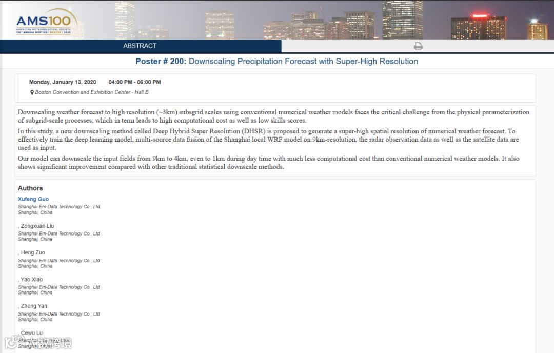 基于对这个问题的长期研究,上海眼控人工智能研究院提出Deep Hybrid Super Resolution (DHSR) 模型模拟物理过程,来产生额外的信息。该论文模型于美国气象协会100周年年会中被收录。