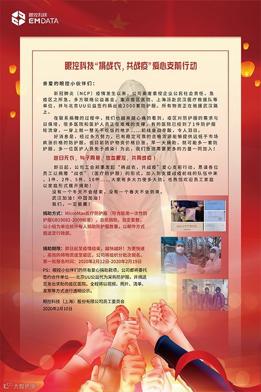 玉山白雪飘零,燃烧少年的心。在复工后,满腔热血的眼控人依然义无反顾的投入到疫情防控的支援行动中。眼控科技发起“捐战衣,共战疫”爱心支援活动,组织眼控人为武汉一线防疫单位捐赠防疫物资,为缓解一线防疫物资紧缺态势贡献眼控力量。