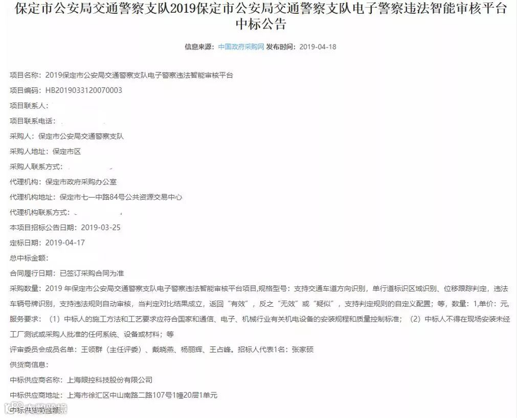 4月18日保定市公安局交通警察支队公开发布2019保定市公安局交通警察支队电子警察违法智能审核平台中标公告,上海眼控科技股份有限公司凭借过硬的技术实力、先进的算法能力、高效的审核识别准确率,成为最终中标人。