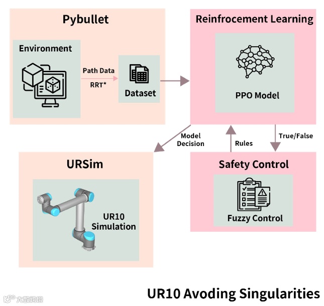 除了上述针对性优化外,该技术还具有更广阔的拓展空间。在应用场景方面,可将单一机械臂的奇点规避技术延伸至多臂协同系统 —— 通过构建多智能体强化学习框架,实现多个机械臂在共享工作空间内的协同避障与奇点规避,满足复杂装配任务的需求;在功能扩展方面,可整合移动障碍物检测模块,将静态奇点规避升级为 “奇点 + 动态障碍物” 的综合规避系统,适配更复杂的工业环境;在硬件部署方面,可开发基于 FPGA 或 ASIC 的专用芯片,实现模糊逻辑决策与强化学习推理的硬件加速,进一步提升系统的实时性与可靠性。