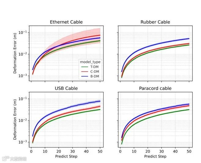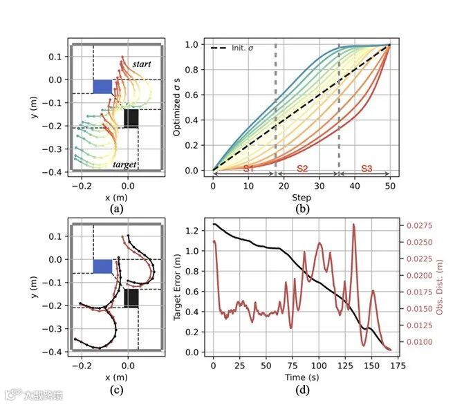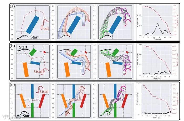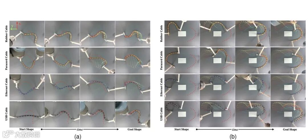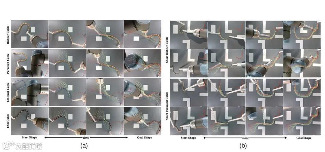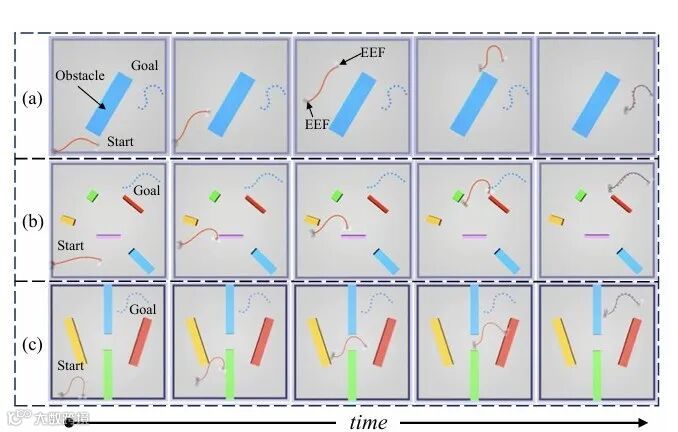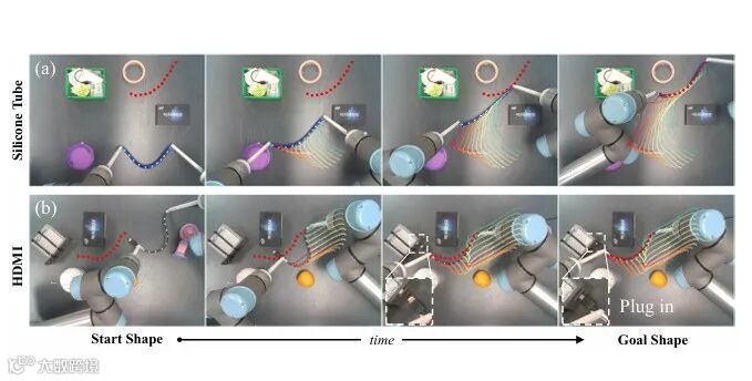 严谨的实验设计与充分的性能验证是该文结论可靠性的重要保障,也直观展现了所提方案的技术优势。该文从仿真实验与真实环境实验两个维度展开验证,构建了涵盖不同约束场景、不同DLOs类型的多样化测试集。在仿真实验阶段,研究团队基于MuJoCo物理引擎搭建了约束环境仿真平台,选取电缆、绳索、缝合线三种典型DLOs,设计了障碍物规避、路径跟随、形状成型三类核心任务,将所提方案与传统模型预测控制(MPC)、强化学习(RL)等方法进行对比。实验结果显示,该文方案在任务完成率、变形误差、计算效率三个核心指标上均表现最优:在复杂约束场景中,任务完成率达到92.5%以上,远超传统方法的60%-75%;DLOs变形轨迹与规划路径的平均偏差小于5mm,满足高精度操纵需求;高层规划平均计算时间小于15秒,低层控制响应延迟在30毫秒以内,能够适应动态约束环境的实时控制需求。在真实环境实验阶段,研究团队采用UR系列协作机器人搭建实验平台,在工业装配约束场景(模拟汽车电缆布线)和医疗微创约束场景(模拟腹腔镜缝合)中进行测试。结果表明,该方案能够有效应对真实环境中的不确定性因素(如机械臂运动误差、环境光照变化),成功完成了电缆穿过狭小孔隙、缝合线精准引导等复杂任务,且操作过程稳定无碰撞。此外,该文还针对不同DLOs材质(柔性橡胶、刚性金属丝、医用缝合线)进行了泛化性测试,验证了方案在不同对象上的适用性。这些实验结果充分证明了所提分层变形规划与神经跟踪方案的有效性、鲁棒性与泛化性,为其在实际场景中的应用奠定了坚实基础。