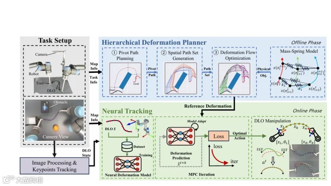 在具身智能与机器人自主学习领域,演示学习在工业自动化、医疗手术、航空航天等关键领域,可变形线性物体(Deformable Linear Objects, DLOs)如电缆、绳索、缝合线的精准操纵是实现自动化升级的核心瓶颈之一。与刚性物体不同,DLOs具有无限自由度和强非线性动力学特性,其变形状态受重力、摩擦力、环境约束等多重因素影响,导致传统操纵方法难以实现精准控制。尤其是在机械装配车间、微创手术腔道、飞机机身内部等约束环境中,DLOs不仅需要规避障碍物,还需保证变形过程的稳定性和任务完成的可靠性,这进一步加剧了操纵难度。《Hierarchical Deformation Planning and Neural Tracking for DLOs in Constrained Environments》(以下简称“该文”)聚焦这一前沿难题,提出了融合层级变形规划与神经跟踪的一体化解决方案,为约束环境下DLOs的智能化操纵提供了全新思路,也为相关领域的技术突破奠定了理论与实践基础。