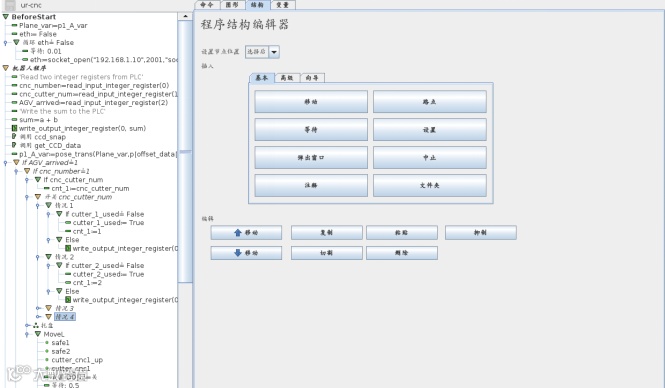 UR和omron智能相机之间通过网络通讯,通讯协议是常用的tcp socket协议。所有硬件都由CB3控制器控制,内部24V直流电源。程序范例如下所示: