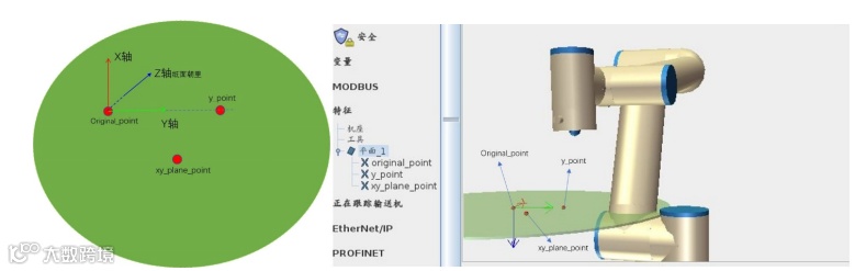 c)最后移动机器人到第3个点,此点定义为xy_plane_point,和前两个点一起确定一个平面xy_plane,平面的法线即为Z轴的方向。对于Z轴正方向的确定要根据与第1个点坐标系的Z轴的夹角来确定,夹角小于180o的方向为正方向。
