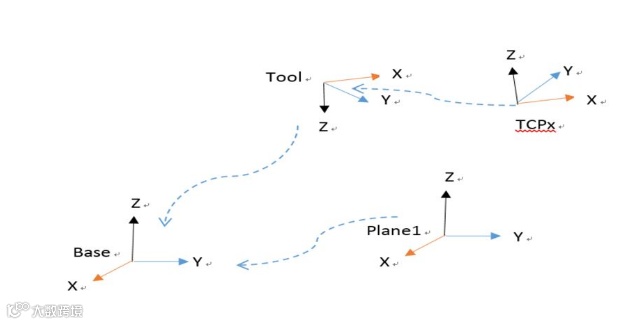 机器人的运动其实是一系列坐标的变化,包括基座坐标系(Base),工件坐标系(Plane1),工具坐标系或法兰坐标系(Tool),TCP坐标系(TCPx)。在UR里面被称作特征。