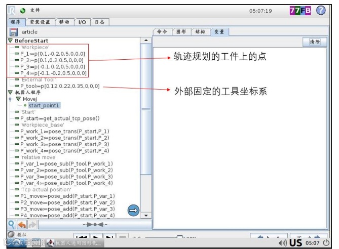 本次以工件上4个位置点为例,沿固定工具移动。为实现以上目的,主要利用了脚本上的Pose_sub()、Pose_add()和Pose_trans()来实现。