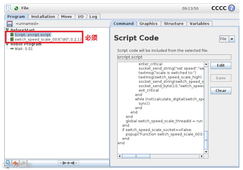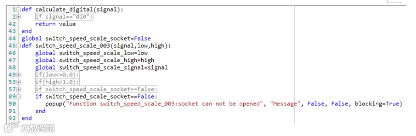 脚本中打开了机器人本身的29999端口,同时调用了一个线程,实时扫描触发信号,当信号被触发,机器人就会向29999端口发送改变当前速度的命令。