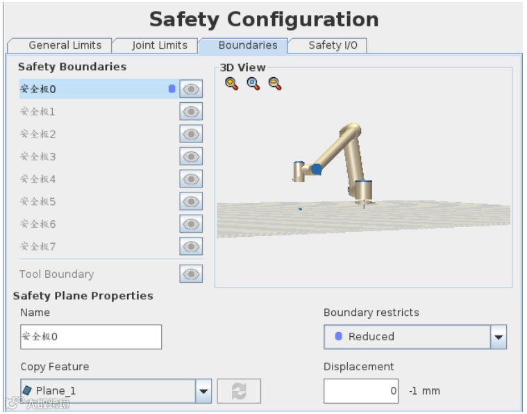 缩减模式可以由安全平面来触发,由安全平面分割机器人快速工作区域与人机交互区域。当机器人的TCP从快速工作区域运动到人机交互区域,一旦机器人TCP接触到安全平面,机器人就从正常模式切换到缩减模式。