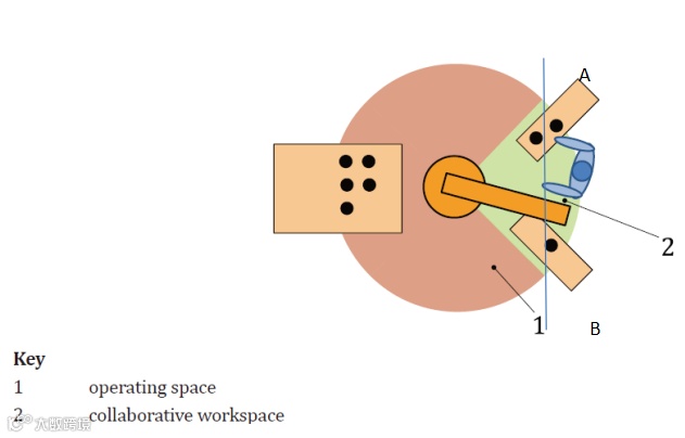 在大多数情况下,机器人需要在最快的速度下完成工作,但是机器人在与人交互的区域,如果TCP速度大于250mm/s,极有可能碰触到人,造成人员的不适。如下图所示:区域1为机器人快速工作区域,区域2位人机协作区域。