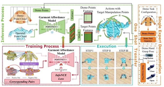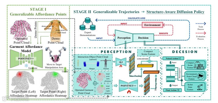 DGL 提出了一种基于 “分层技能学习 + 多模态感知融合” 的通用策略学习框架,旨在学习衣物操作的通用规律,提升策略的泛化能力与灵巧性。该框架分为感知层、技能层、任务层三个层级,形成端到端的策略学习流水线。