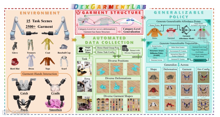 Dexterous Garment Lab 的核心设计理念是 “标准化环境 + 通用策略 + 跨域迁移”,通过三大核心组件的协同工作,构建了从数据生成、策略训练到真实部署的全流程解决方案。其整体架构如图 1 所示(基于论文核心逻辑重构),涵盖仿真环境、通用策略学习框架、真实世界验证平台三部分。