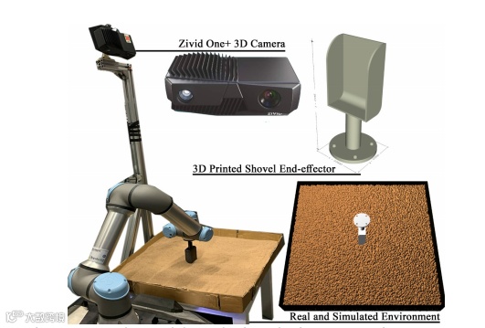 真实世界硬件:UR5e 机械臂(负载 5kg,定位精度 ±0.03mm)、3D 打印铲斗(材质为 ABS,铲斗容量 100cm³)、Zivid One+ 3D 深度相机(分辨率 2048×1536,采样频率 10Hz)、Intel Core i9-13900K CPU+NVIDIA RTX 4090 GPU(边缘计算平台);