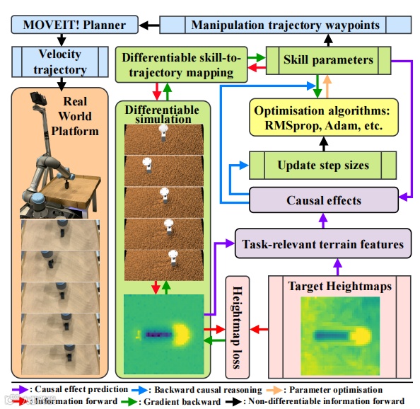 针对上述困境,研究团队提出Celebi’s Choice(简称 Celebi)—— 一种融合因果分析与可微分仿真的颗粒材料操作技能优化框架。该框架借鉴 “Celebi” 的神话寓意(象征 “先知” 与 “精准预判”),通过因果分析识别技能参数与任务结果的核心关联,实现自适应梯度调整;同时依托高保真可微分仿真建模颗粒动力学,最终达成 “高效收敛、精准操作、强跨域迁移” 的目标,为颗粒材料操作技术的工程化落地提供新路径。
